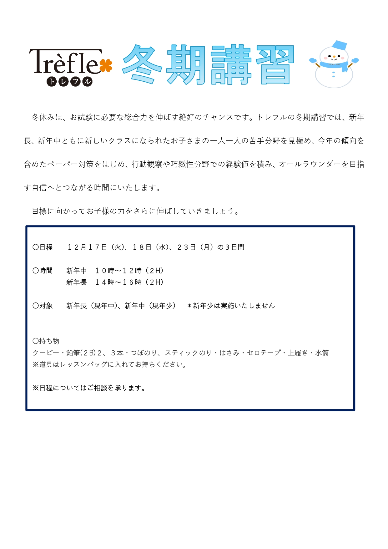 【お申し込み方法】ホームページからお申し込みください。https://trefle-study.com/contactお問い合わせ内容「その他」を選択し、お問い合わせ内容欄に「冬期講習」とご記入ください。